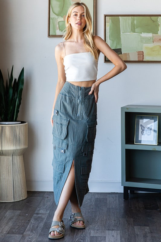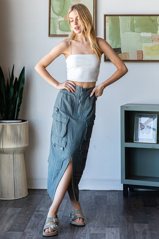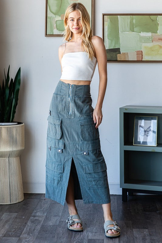 WASHED FRONT SLIT DETAIL CARGO SKIRT- MINERAL WASH DETAIL- RELAXED FIT- TRUE TO SIZE- OUR MODEL IS ALWAYS WEARING SIZE "S"