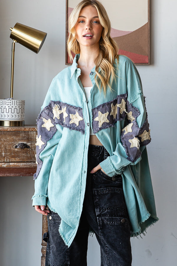 WASHED STAR PATCHWORK BUTTON DOWN SHACKET- MINERAL WASH DETAIL- RELAXED FIT- TRUE TO SIZE- OUR MODEL IS ALWAYS WEARING SIZE "S"