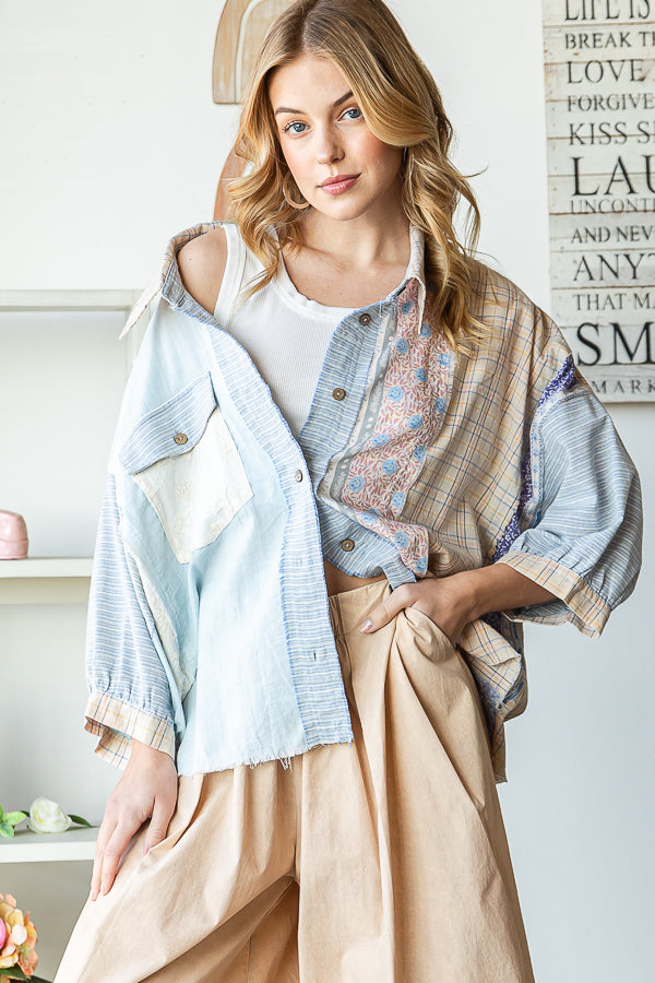 PATCHWORK BUTTON FRONT SHIRT- MINERAL WASH DETAIL- RELAXED FIT- TRUE TO SIZE- OUR MODEL IS ALWAYS WEARING SIZE "S"