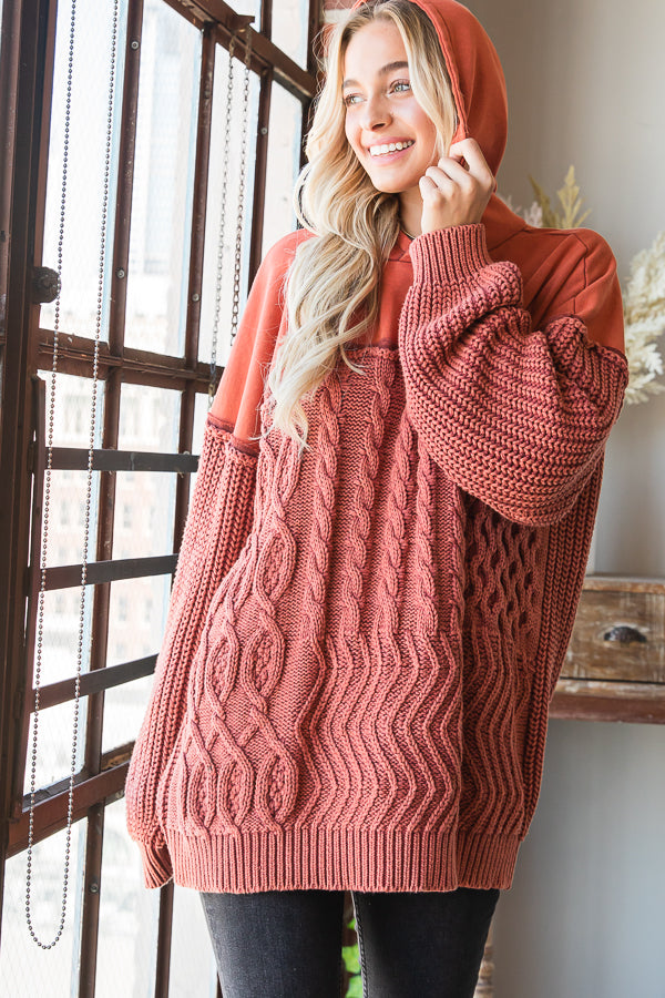WASHED CONTRAST YOKE HOODED PULLOVER SWEATER TOP