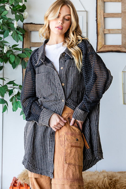 WASHED MIX MEDIA LONG SLEEVE FRAYED HEM SHIRT- MINERAL WASH DETAIL- RELAXED FIT- TRUE TO SIZE- OUR MODEL IS ALWAYS WEARING SIZE "S"