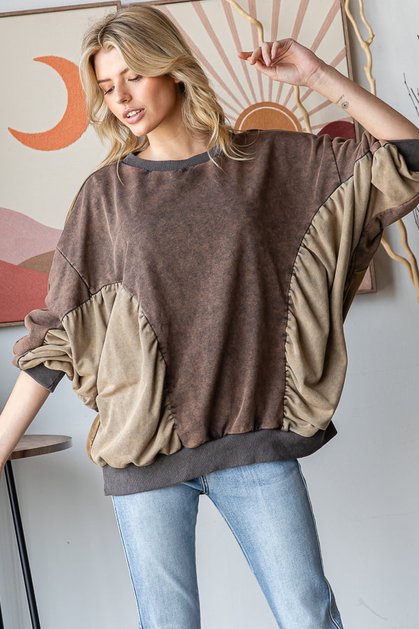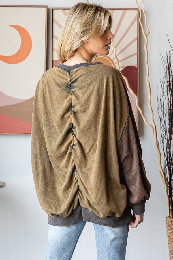 WASHED COLORBLOCK CINCHED DETAIL PULLOVER TOP - MINERAL WASH DETAIL- RELAXED FIT- TRUE TO SIZE- OUR MODEL IS ALWAYS WEARING SIZE "S"