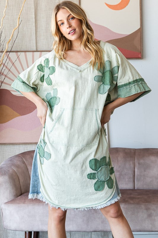 WASHED FLOWER PATCHWORK WIDE NECK TUNIC TOP