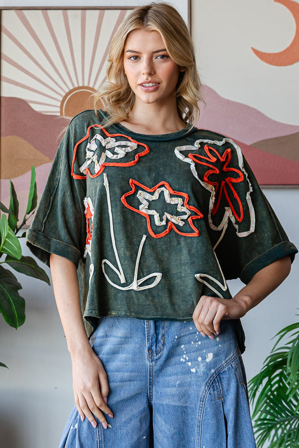 WASHED FLOWER APPLIQUE SHORT SLEEVE KNIT TOP