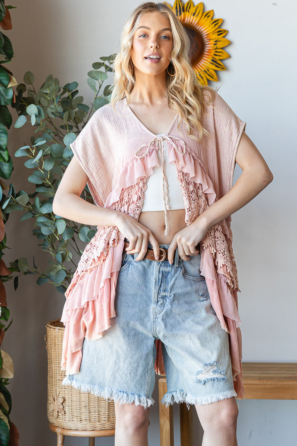 WASHED LACE TIERED TIE FRONT DETAIL SLEEVELESS TOP- MINERAL WASH DETAIL- RELAXED FIT- TRUE TO SIZE- OUR MODEL IS ALWAYS WEARING SIZE "S"