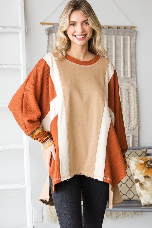 WASHED COLORBLOCK HILOW HEM PULLOVER TOP